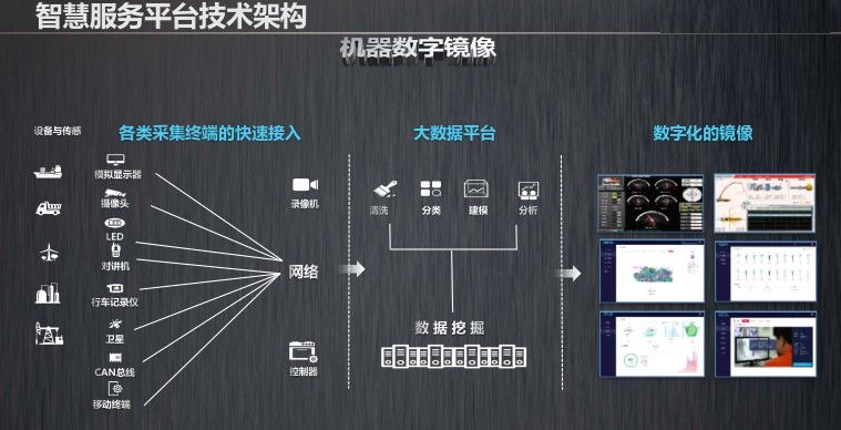 在前端,利用各种摄像和传感设备,包括摄像头、模拟显示器、LED、对讲机、行车记录仪、卫星、移动终端、CAN总线(包含车辆CAN总线),实时收集车辆各类数据,通过3G、4G网络,传输到运营平台里的ECC。我们通过对数据的清洗、分类、建模和分析,进行深度的数据挖掘,最后展示出数字化的镜像。显示的数据包括设备大数据(发动机转速、发动机温度、油温、燃油油位)、位置服务、负荷监控(压力、发动机负荷、工作时长)、轨迹分析、设备利用率等。